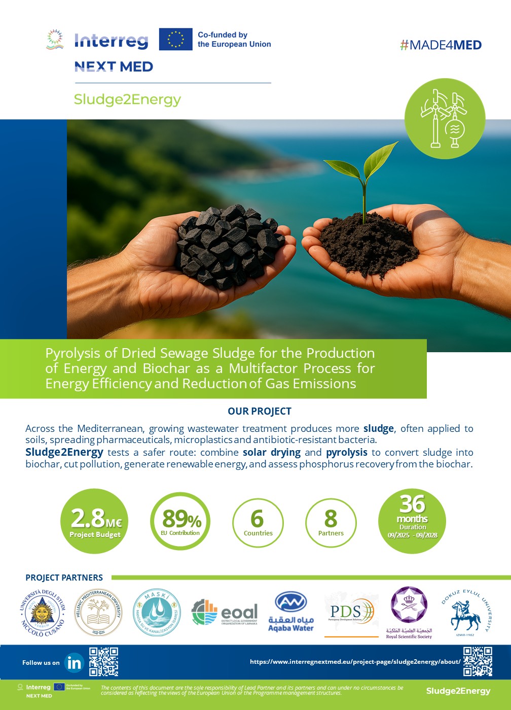 The Royal Scientific Society is an official partner of Sludge2Energy. The project is co-funded by the European Union under the Interreg NEXT MED Programme. Sludge2Energy aims to demonstrate an innovative circular solution that converts solar-dried sewage sludge into renewable energy and biochar at Mediterranean wastewater treatment plants. Our team provides scientific and technical support, carrying out laboratory and field tests on sludge and biochar, and contributing to the optimisation and sustainability assessment of the proposed solution.